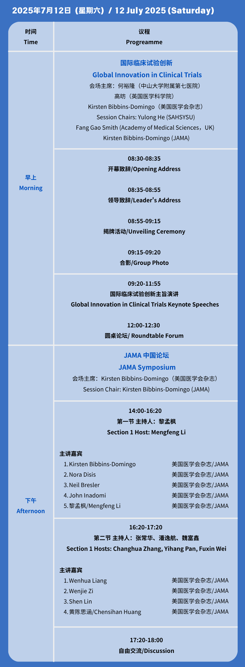 本次会议将以全球临床研究创新与发展为主题,聚焦国际前沿进展,特邀国内外临床研究领域的权威专家开展深度学术研讨。会议设置四大特色板块:JAMA中国学术研讨会、BAY TRIAL学术论坛、中山七院“三名工程”团队联席大会及国际临床研究培训工作坊。通过多层次、多维度的学术交流,系统展示全球临床研究领域的最新成果、创新理念和尖端技术,旨在搭建高水平的国际合作平台,促进国内外专家学者深度学术对话与科研协作,共同推动我国临床研究水平的提升与发展。